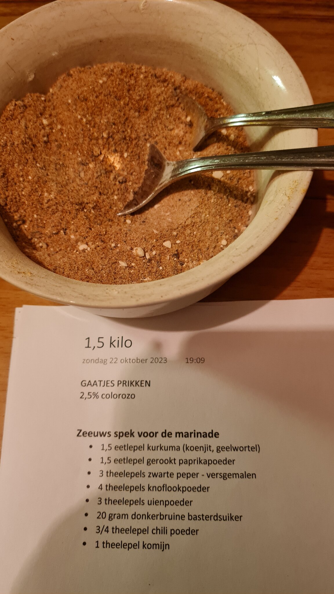 Er is voor gekozen om op basis van het Zeeuws Spek-recept een rub te maken en daarin het buikspek 1,5-2 weken te laten "genieten".