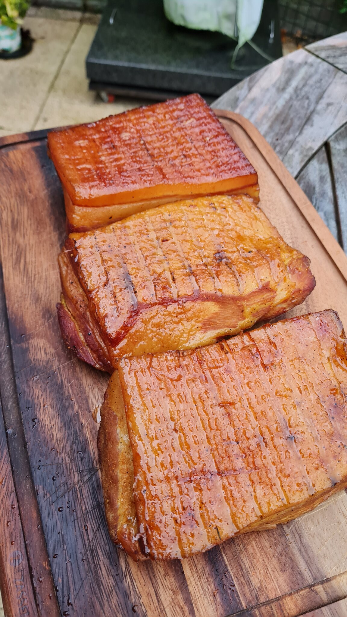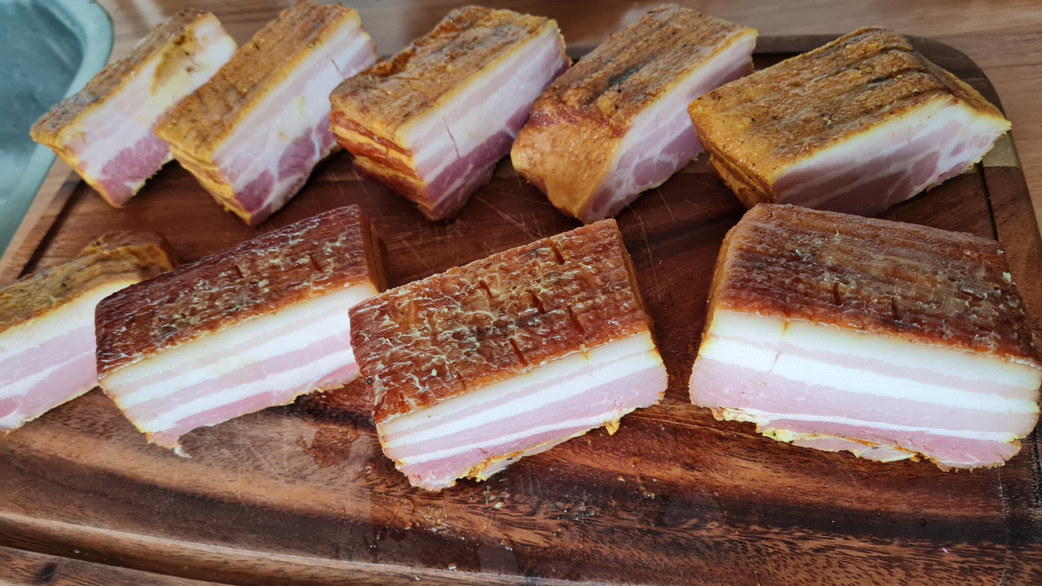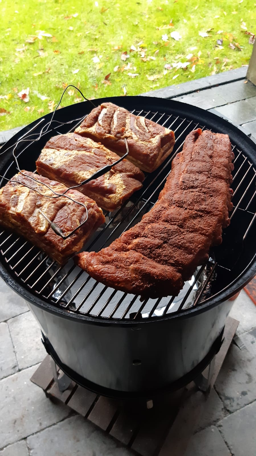 Vervolgens is afgelopen weekend de buikspek op de wsm gegaan, in goedgezelschap van een ribje, en na ca 3 uurtjes was er weer een heerlijke voorraad bacon met een lekker smaakje.