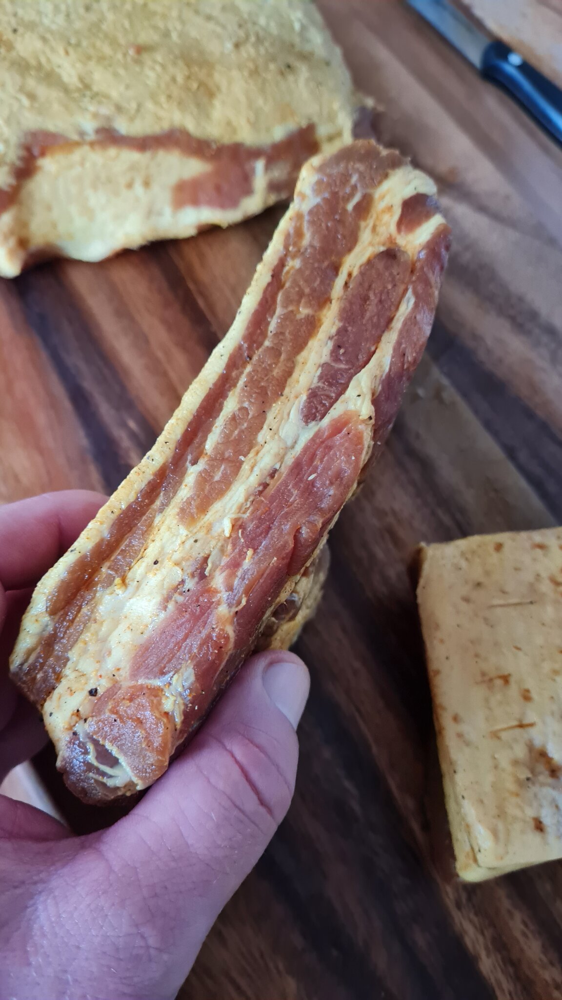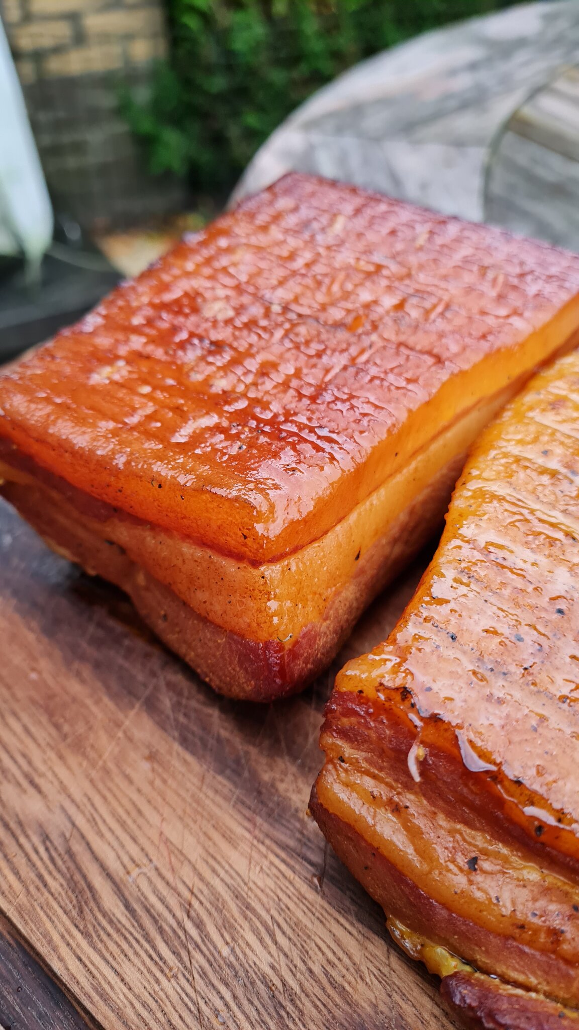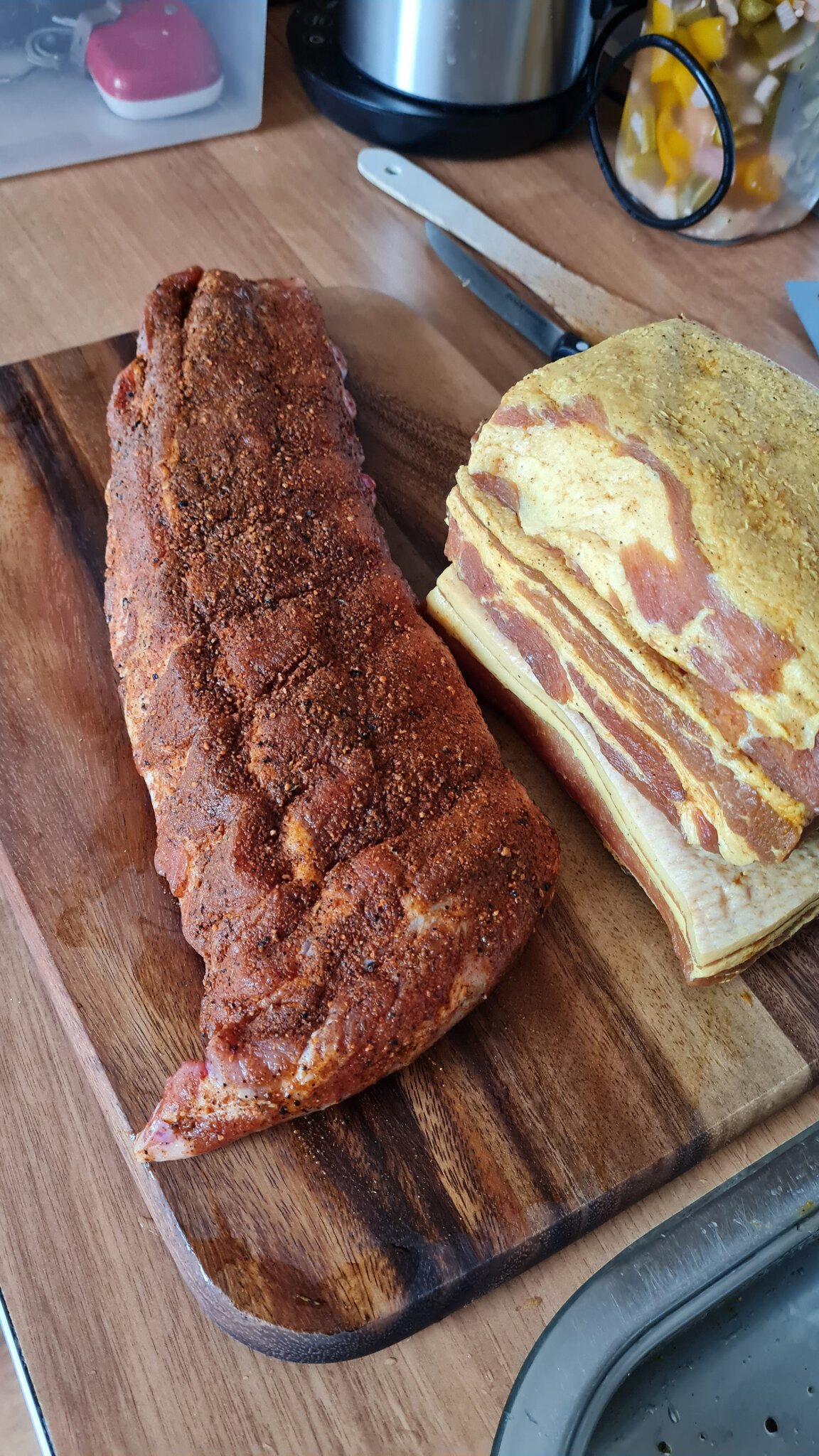 Vervolgens is afgelopen weekend de buikspek op de wsm gegaan, in goedgezelschap van een ribje, en na ca 3 uurtjes was er weer een heerlijke voorraad bacon met een lekker smaakje.