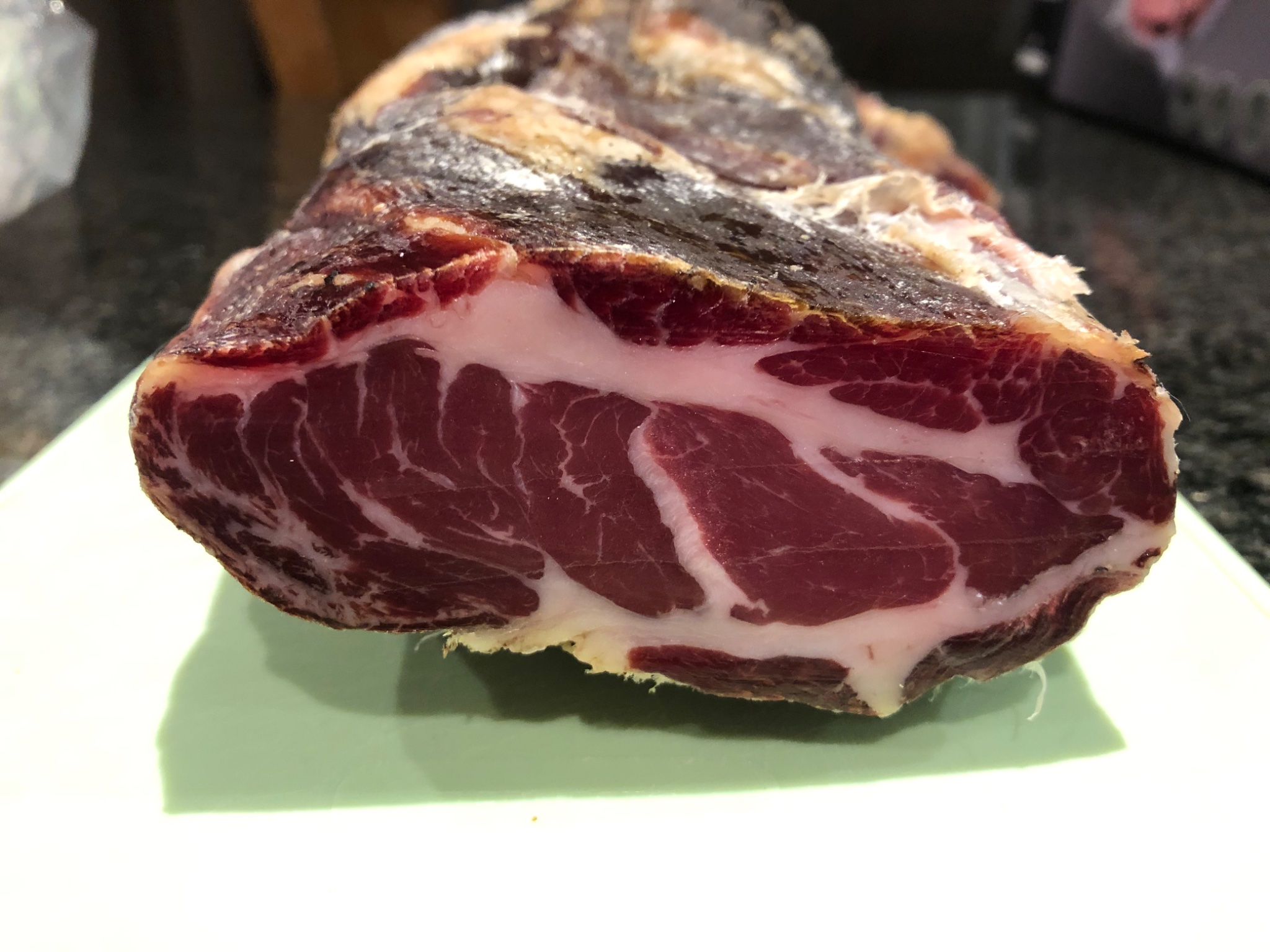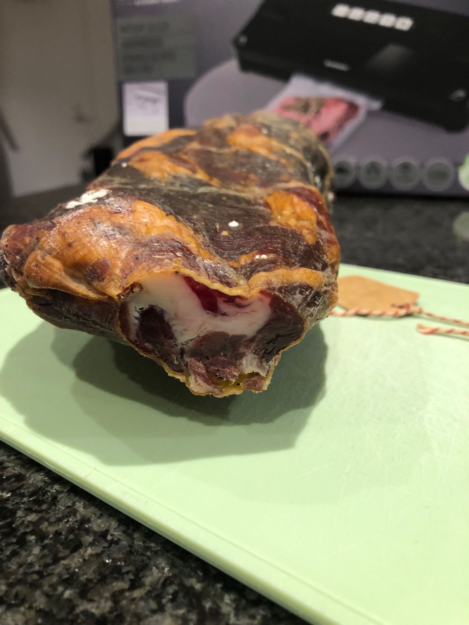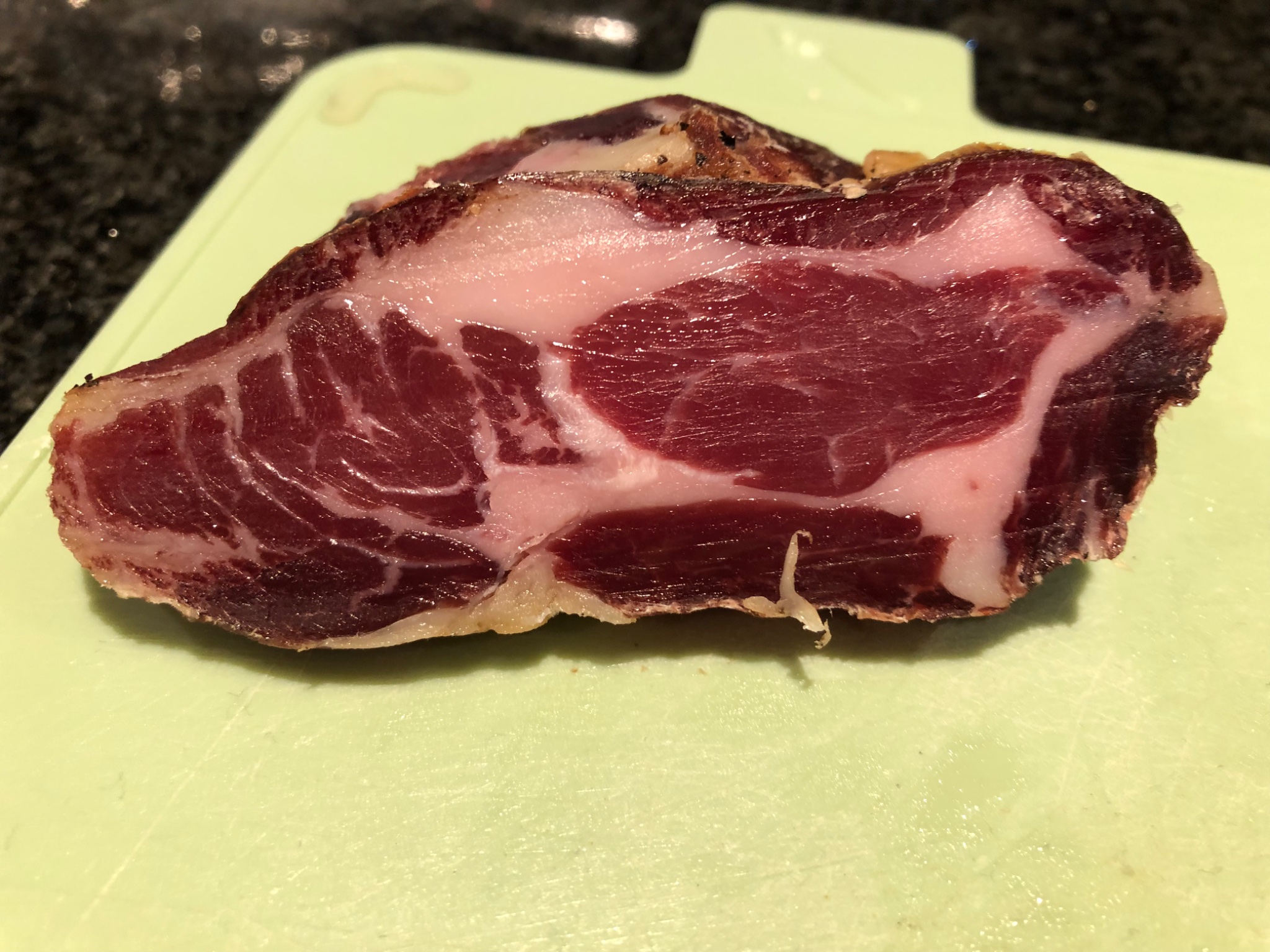 Van de week mijn Coppa Corse uit de kast gehaald die vond ik wel mooi op gewicht. Deze is alleen maar met Knoflookpoeder, Zwarte Peper, Suiker en Nitrietzout behandeld en daarnaast is die 2 x 8 uur koud gerookt op beuken en heeft die wat maanden in de kast gehangen. Met dit als resultaat