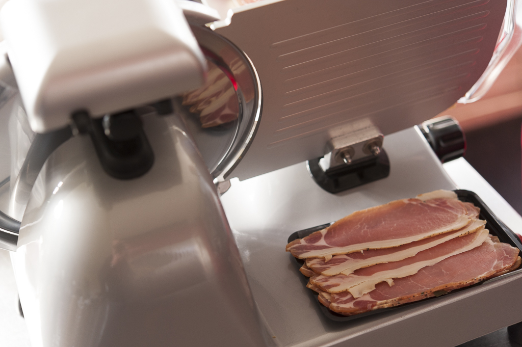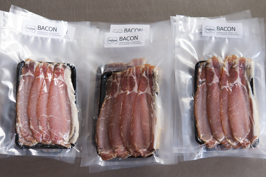 Na het koudroken heb ik de bacon in z'n geheel weer een paar dagen vacuum gehouden om de rook smaak lekker door te laten trekken. Daarna mocht er dus productie gedraaid worden: