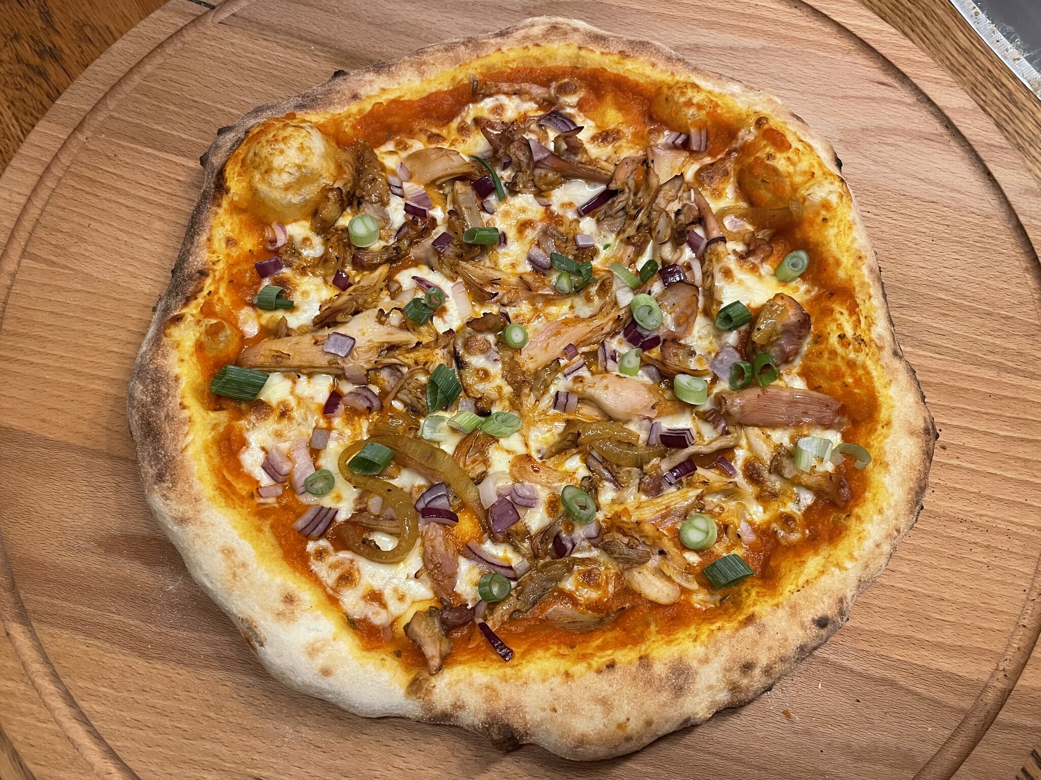 Die eerste is met pulled chicken, rode ui en na het bakken wat lente-ui erover.