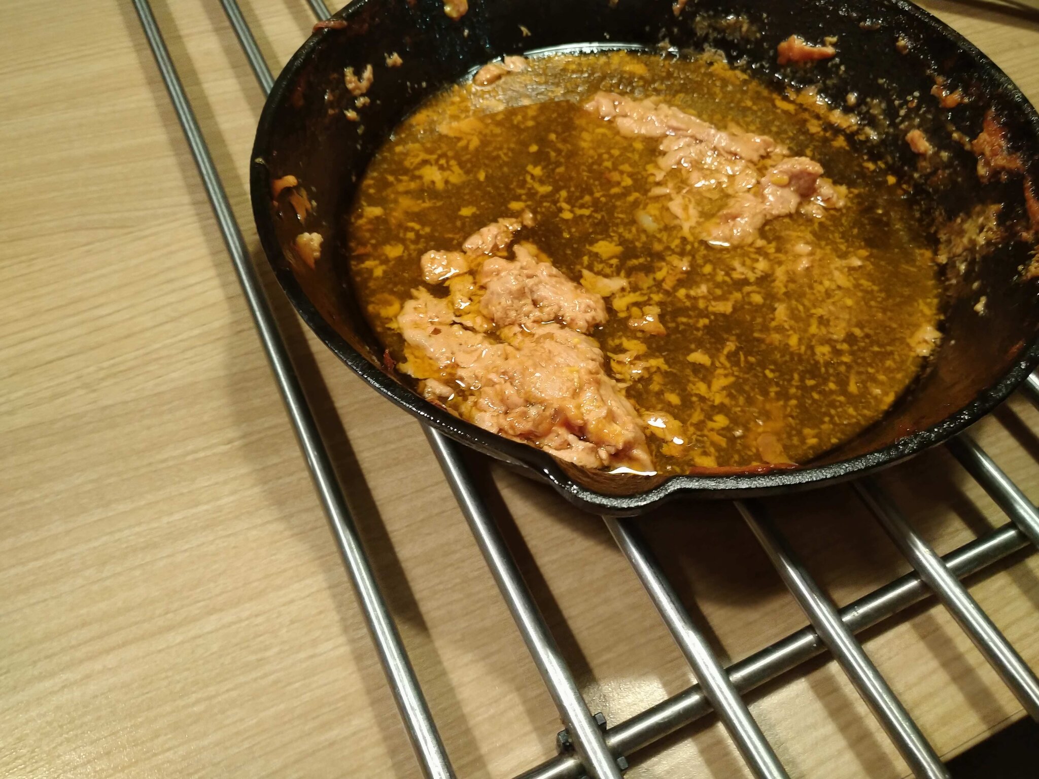 Er was wel redelijk veel vet en eiwit verzamelt onderin de skillet,