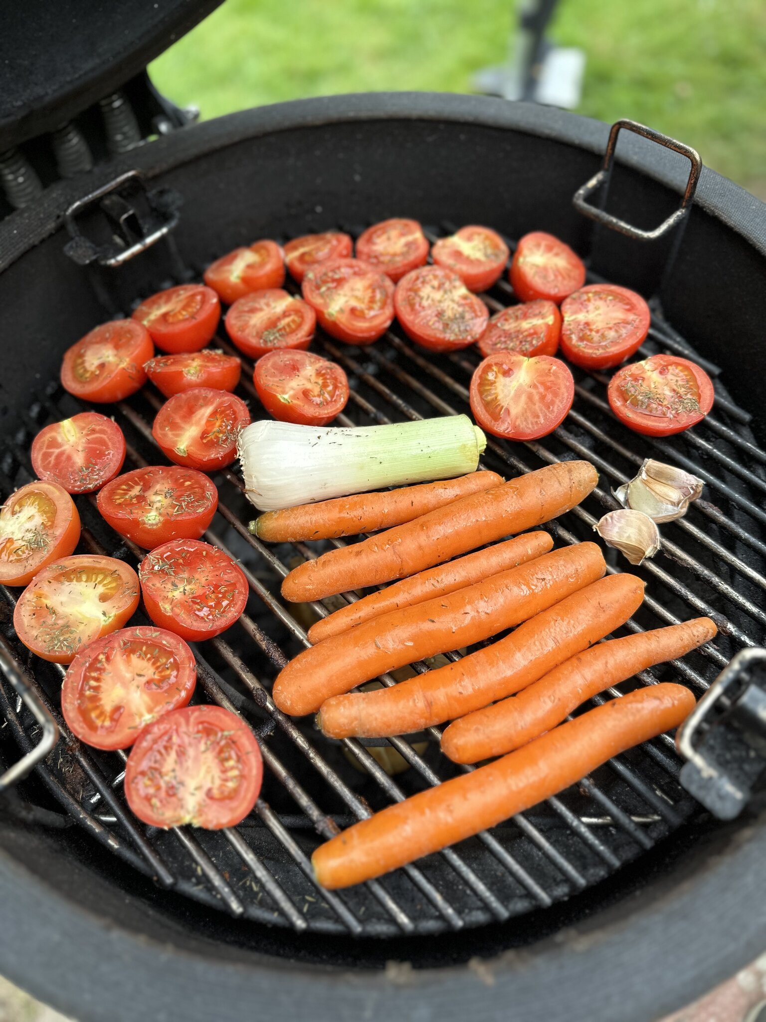 Ik zet de groenten meestal aan op het rooster, direct boven de kolen maar zonder rookhout. Uien (en evt. prei) caveman style eronder. Na een mooie karamellisatie gaat alles in de DO met water en kruiden, geblakerde delen gepeld uiteraard. Resultaat: een heerlijke soep met subtiele grillsmaak! En, de volgende dag nog lekkerder ;-)