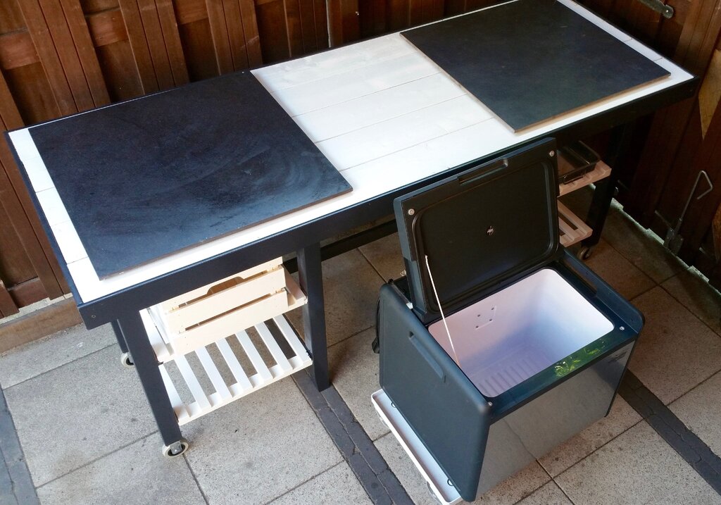 twee tafeltjes gebruikt met ruimte er tussen voor de koelbox.