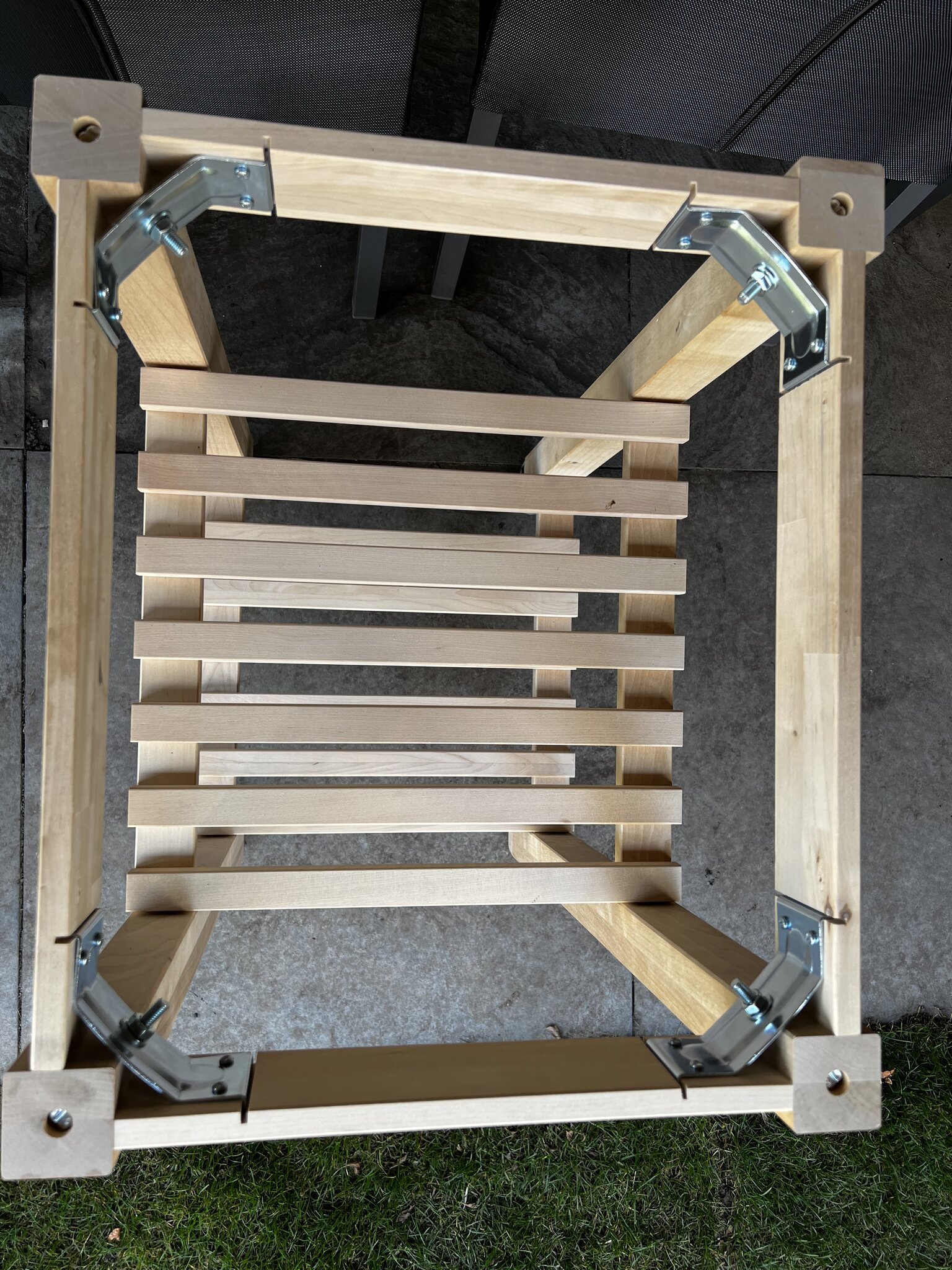 Je ziet dat de metalen dingen op de hoek nu met een sleuf in de zijkanten klemmen. En dat de zijkanten nog een centimeter naar buiten kunnen. Ik heb dus een klein plankje/blokje van 1 cm gemaakt die daar tussen valt en waar de metalen dingen dan precies achter haken (geen sleuf meer dus) en met schroeven vast gezet.Ik heb even wat hulp nodig, want blijkbaar 2 linkerhanden.