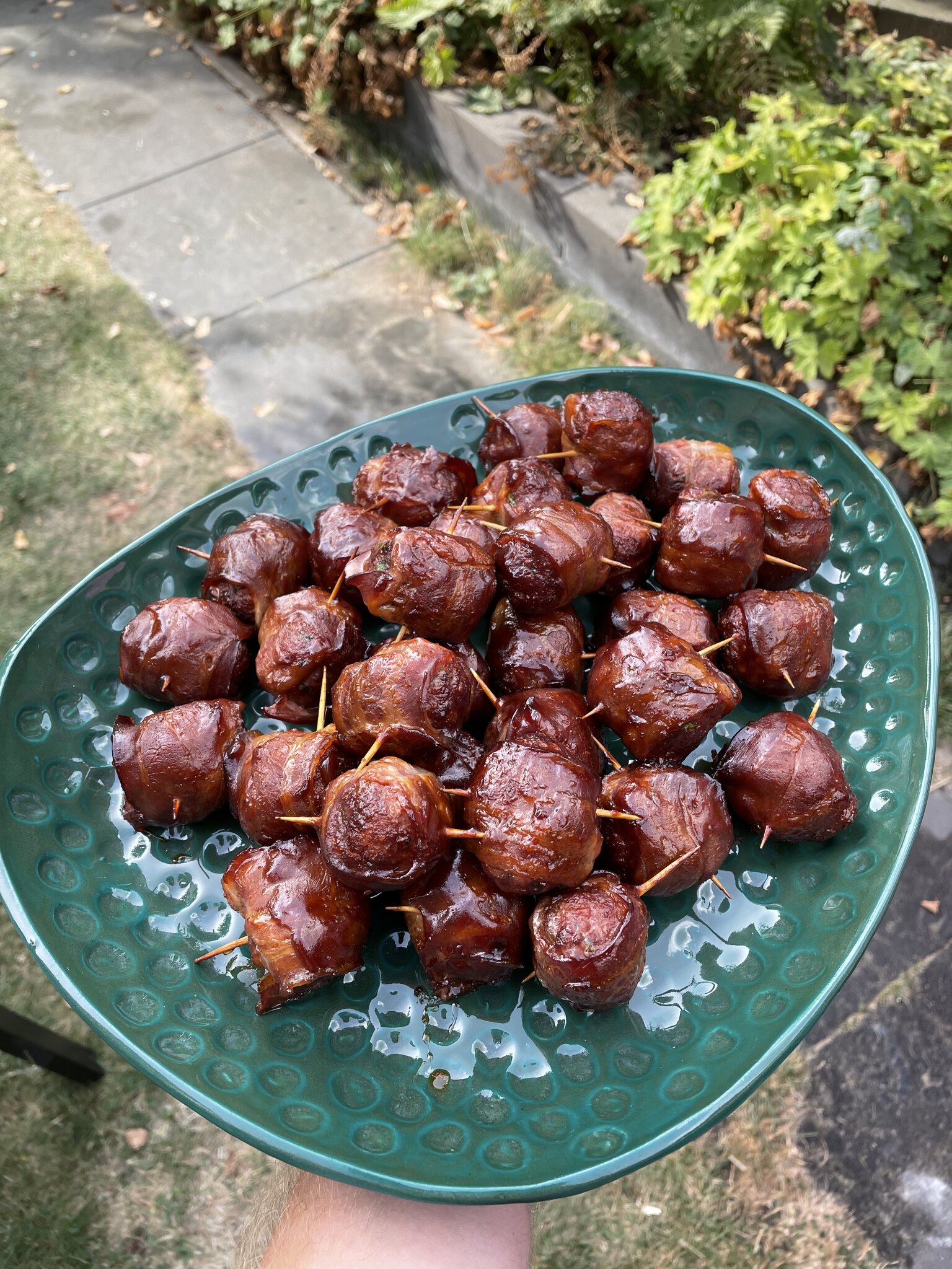 Een paar in bacon gewikkelde ballen op een stokje. En een spiesje dik gesneden bacon in sate marinade.
