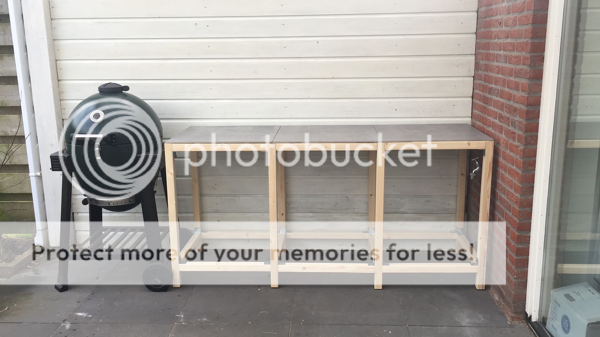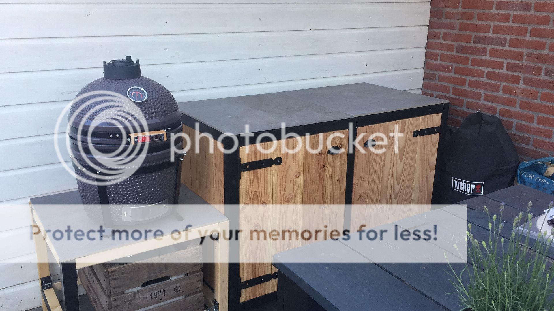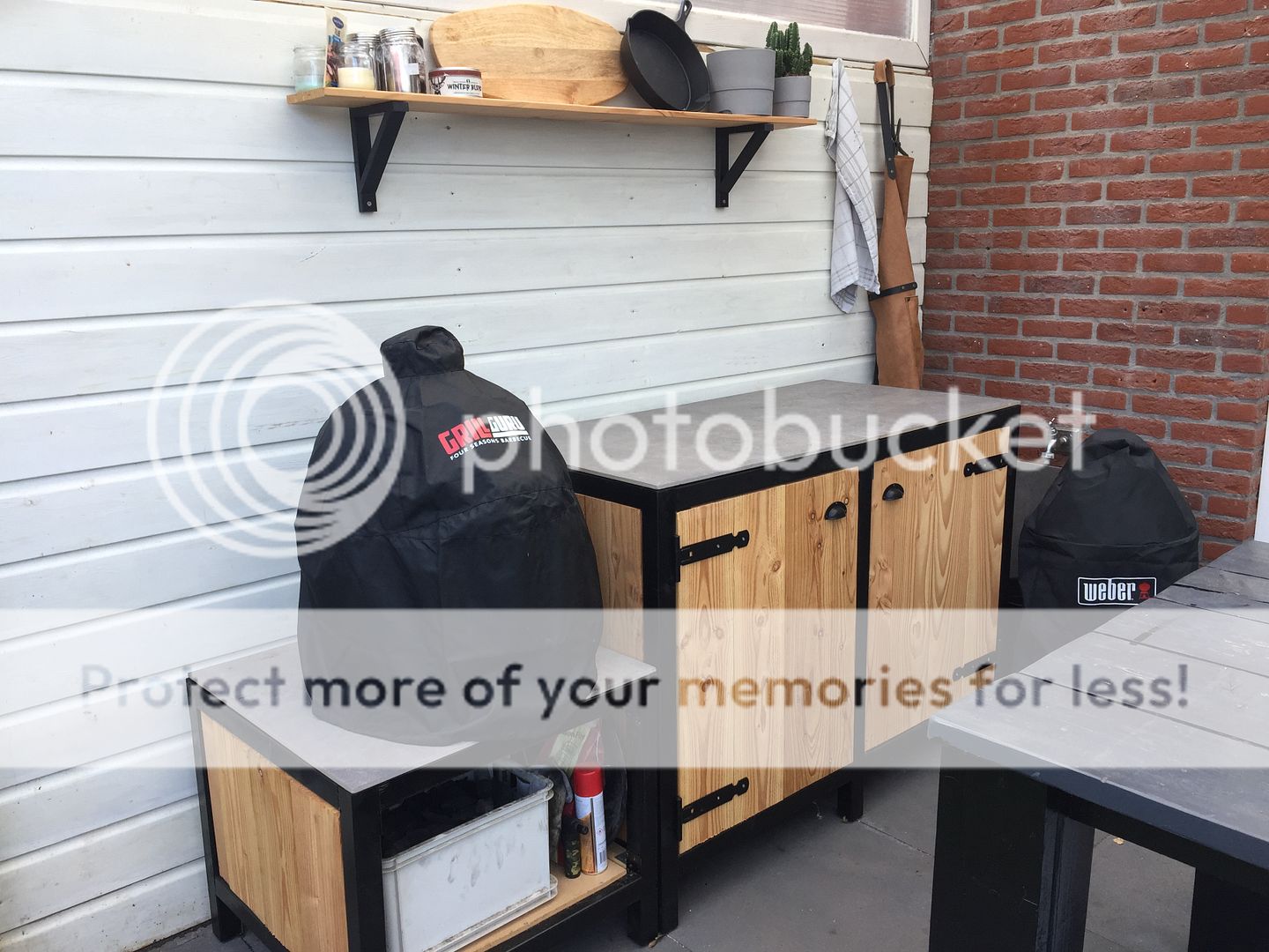 Het enige wat ik nog wil doen, is een deurtje maken in het kastje onder de Grill Guru, net zoals de grotere kastjes daarnaast dat hebben. Verder erg tevreden, is makkelijk in gebruik en alles is netjes opgeborgen. Wellicht voor in de toekomst ook nog een wasbak maken en ik wil nog wat bedenken op het blijven hangen van rook onder de overkapping..