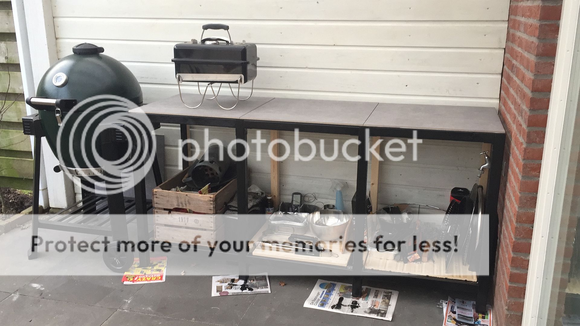 Ik vond de tegels toch wat ielig, dus heb een betonnen blad en betonnen tegel voor onder de Grill Guru gegoten. Staat een stuk beter vind ik zelf..