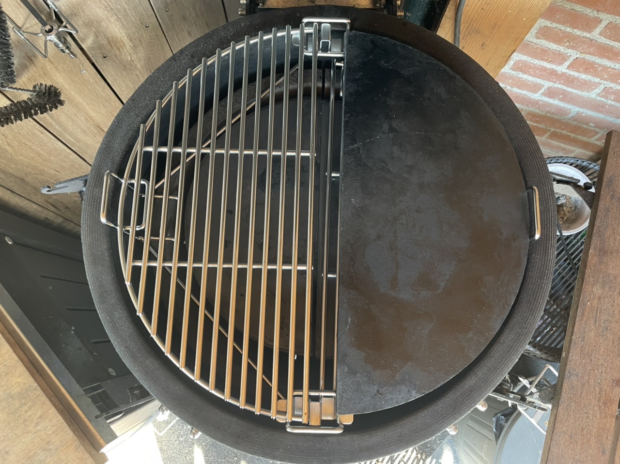 Mijn steentjes, die ik ook gebruik voor de BGE komen ook hier mooi van pas, zodat de airflow niet te veel hinder ondervindt. Daarmee past het geheel precies onder het rooster. Kortom helemaal blij.