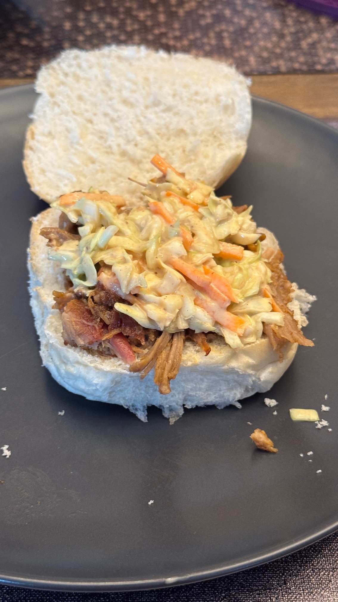 Met zelf gemaakte coleslaw volgens Noskos recept.