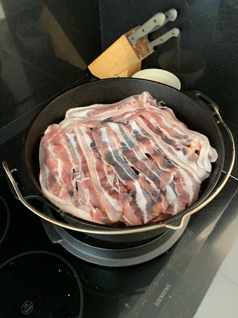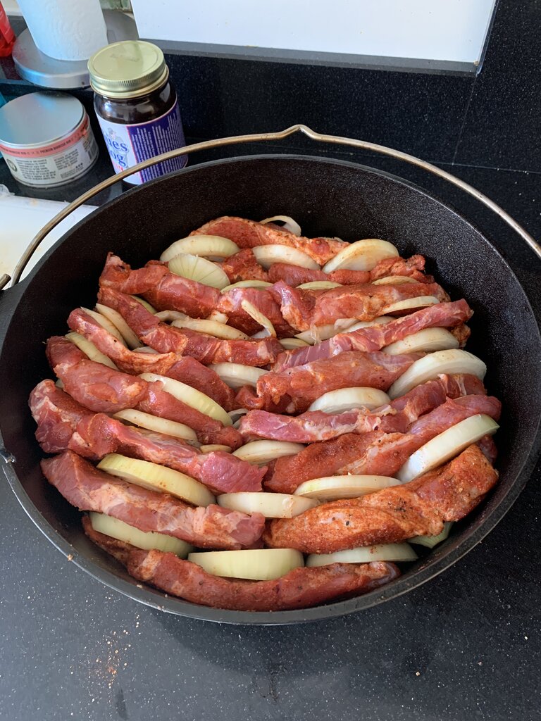Voor schichtfleisch gebruik ik 2,5 kilo procureur, kilo uien, ontbijtspek, varkensrub, bleus hog bbq saus. Snij de procureur in steaks van 1 cm dik en bestrooi deze met de rub. Schil de uien en snij in schijven. Beleg de bodem van de Dutch oven met ontbijtspek, leg een steak tegen de zijkant van de Dutch oven, maak dan een rij met de uischijven, dan weer een rij vlees enz. Verdeel hierover 250 ml bbqsaus en dek af met een laag ontbijtspek. 10 briketten onder de Dutch oven en 8 op de deksel. Laat 4 uur sudderen. Na 4 uur trek je alles uit elkaar zoals bij pulled pork verwissel halverwege wel even de briketten. Misschien wel lekkerder als pulled pork en je bent zo’n 4 uur eerder klaar. Als afwisseling kan je ook nog paprika toevoegen bij de ui.