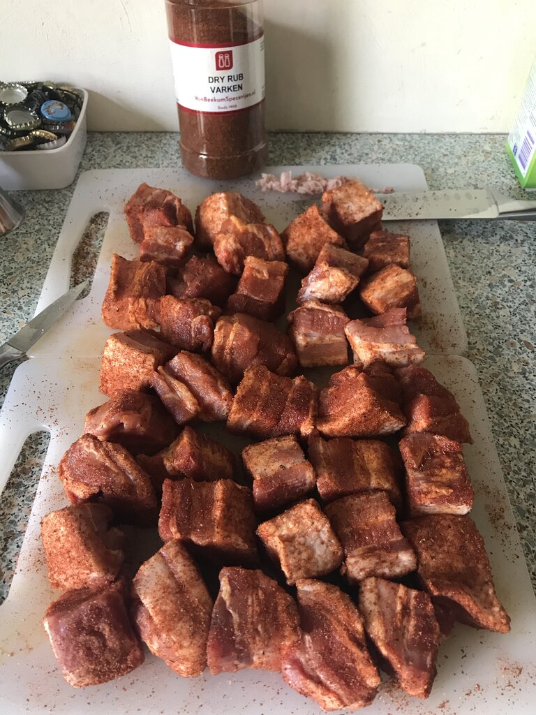 Het vlees schoongemaakt en in flinke stukken gesneden (3-4 cm h x b x d) en in de rub gezet: