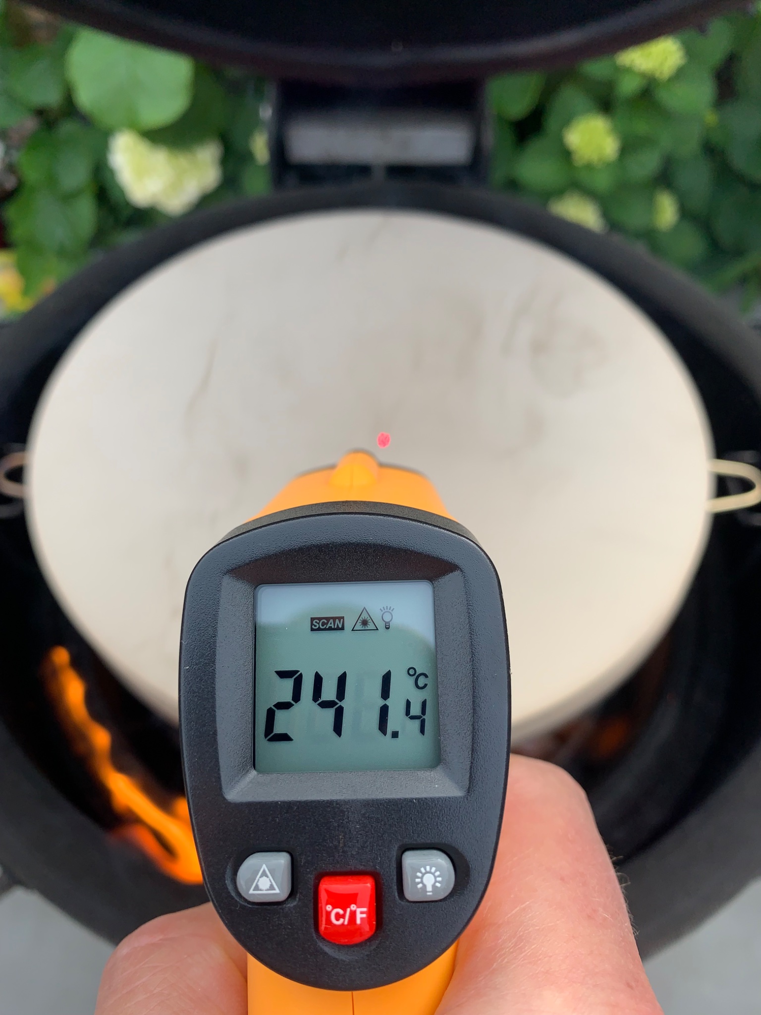 Het stond al langer op mijn lijstje om eens te maken; pizza. Gisteren is het er dan eindelijk van gekomen en het smaakt (hoe kan het ook anders) naar meer. Ik ben zeer te spreken over het kant en klaren deeg van Van Lemmen (mag ik dat hier zeggen? Geen reclame) maar ik blijf een kluns met deeg dus vandaar de niet zo ronde vormen. Practice makes perfect. Ik lette even niet op en toen schoot de temperatuur ver door boven de 400 graden C; weet niet of m’n vilt daar zo blij mee was. Tussen de heat deflector en de pizzasteen had ik koperen kapjes (bouwmarkt) gezet en dat werkte prima.
