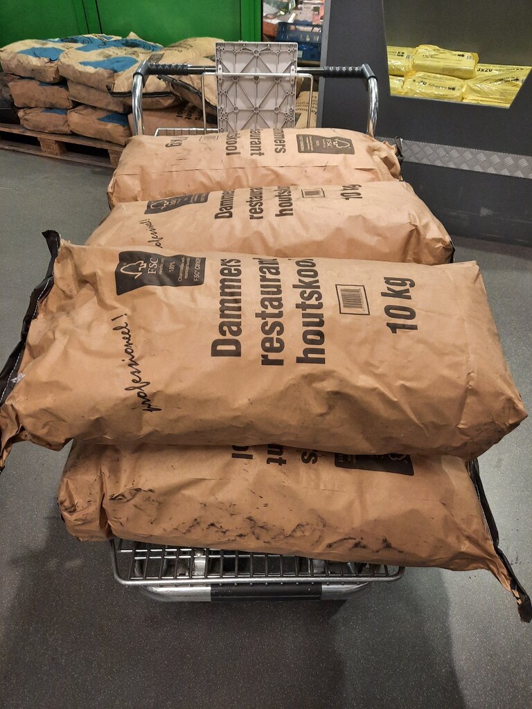 Hoewel de aankoop van houtskool in tuincentra in het algemeen wordt afgeraden, me intussen ook laten verleiden door een aanbieding van het Belgische tuincentrum Aveve, waarbij ze toen €2 korting aanboden per zak bij een minimum aankoop van 2 zakken. Mooie grote chuncks houtskool, die zeer lang branden. Wanneer ik er nog eens ben en ik een zak kan meenemen van bovenop een pallet, zal ik dit zeker doen.