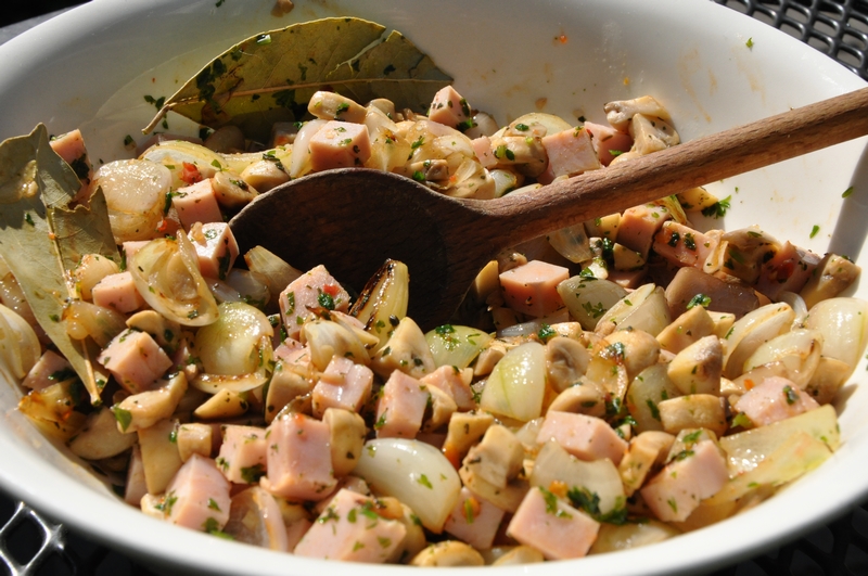 In een schaal de sjalotjes/knoflook en champignons doen samen met de hamblokjes, tl. Sambal, tijm en peterselie en schep even door.