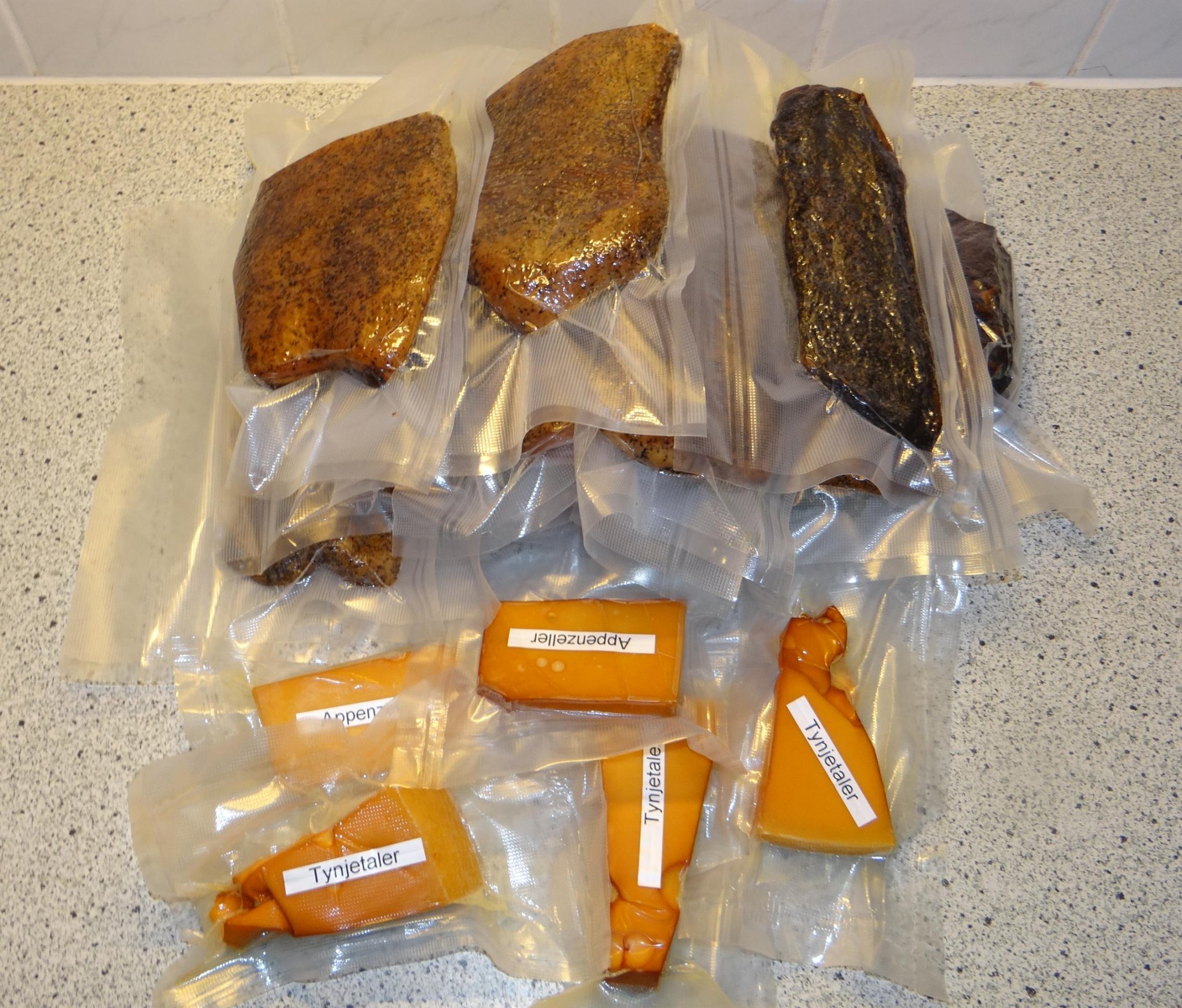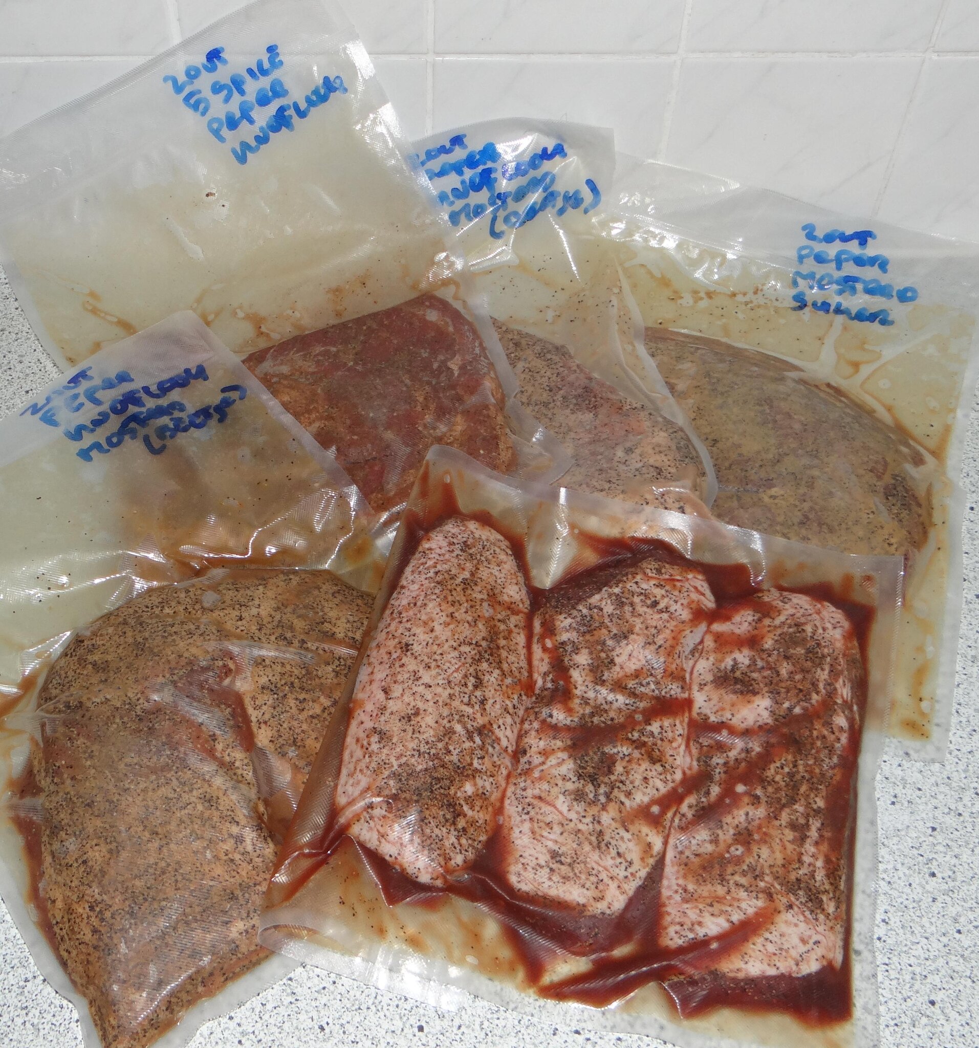 Dit is 4kg buikspek zonder zwoerd (en 3 eendenborst filetjes, want als ik dan toch al bezig ben...). Elk stuk is inmiddels een dikke week gepekeld in vacuümzakken, met nitrietzout plus verschillende kruiden waaronder peper, mosterdzaad, Chinese 5 spice, knoflook en bruine suiker. Ik volg geen specifiek recept, maar ga gewoon wat verschillende dingen uitproberen. Ik ben vooral erg benieuwd naar die met gemalen mosterdzaad.