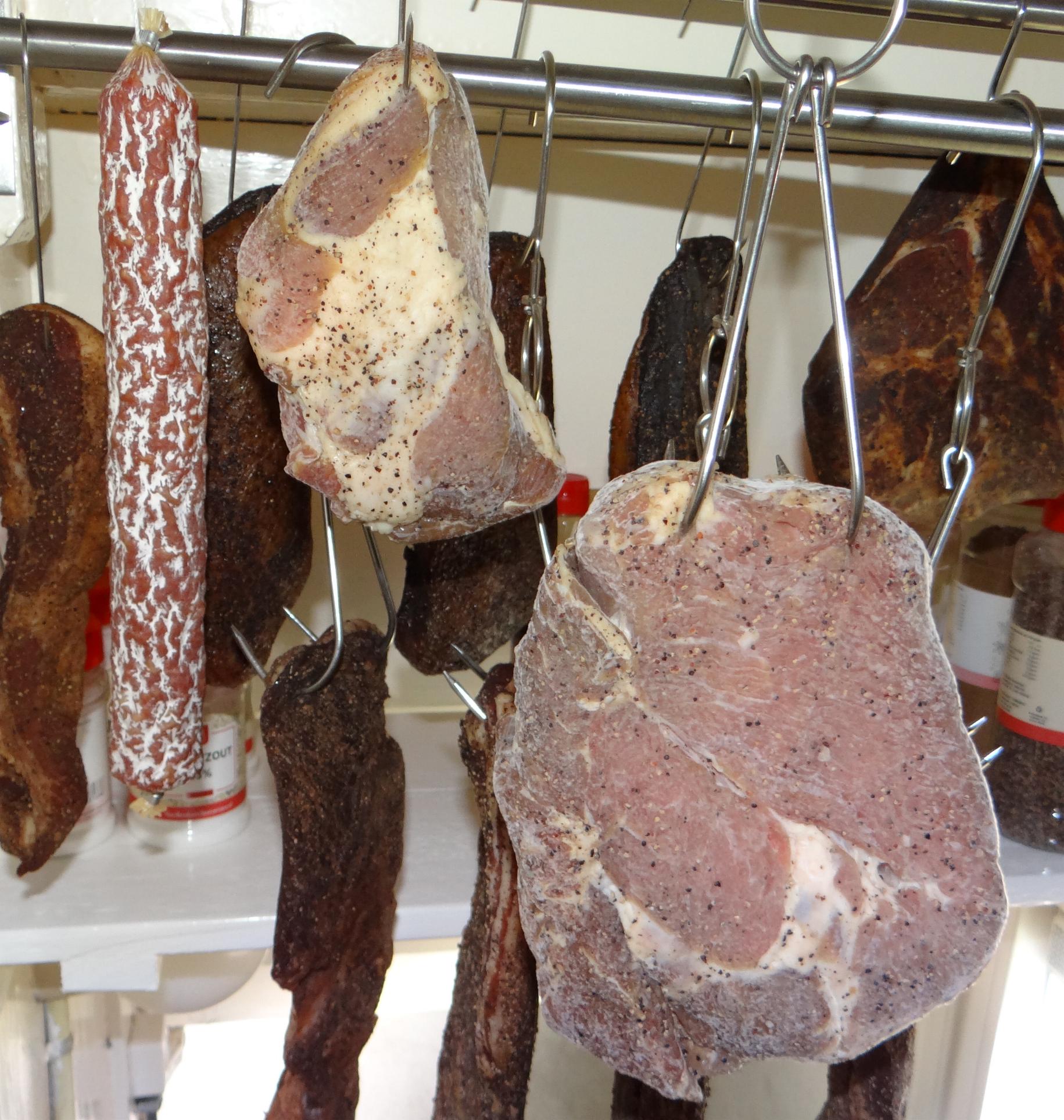 Dat stuk links was trouwens een kilo procureur, nu 730gr. Die gaat ook goed, maar droogde eigenlijk wel wat te snel en ik begon me zorgen te maken om case hardening. Dus die moet nu een weekje in een vacuümzak, om het vocht wat gelijkmatiger te verdelen, en daarna hang ik hem weer op om de laatste 100ml ook nog te verliezen.