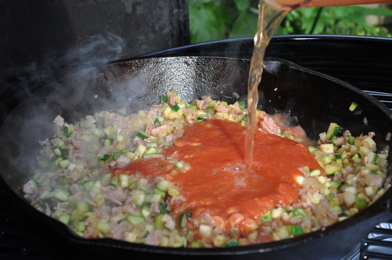 Uien fijnsnijden, bacon in stukjes snijden, olijfolie in skillet verhitten, bacon op zacht vuurtje ca. 5 minuten bakken, de uitjes toevoegen en ca. 5 min. meebakken, courgette in kleine stukjes toevoegen en knoflook uitgeknepen toevoegen en ook ca. 5 zachtjes meebakken.