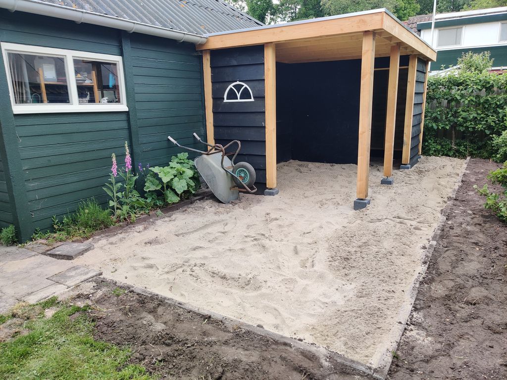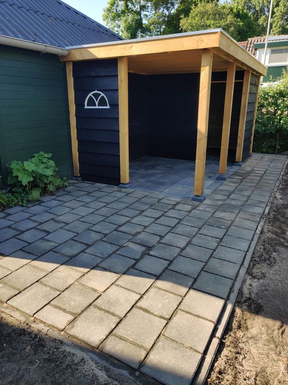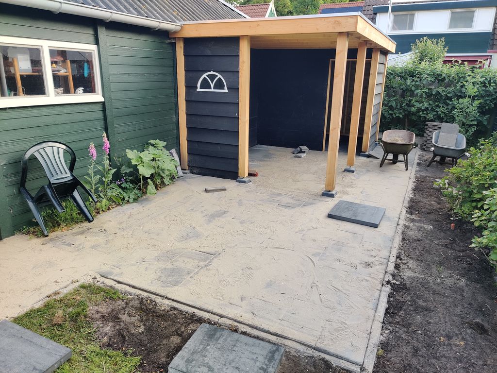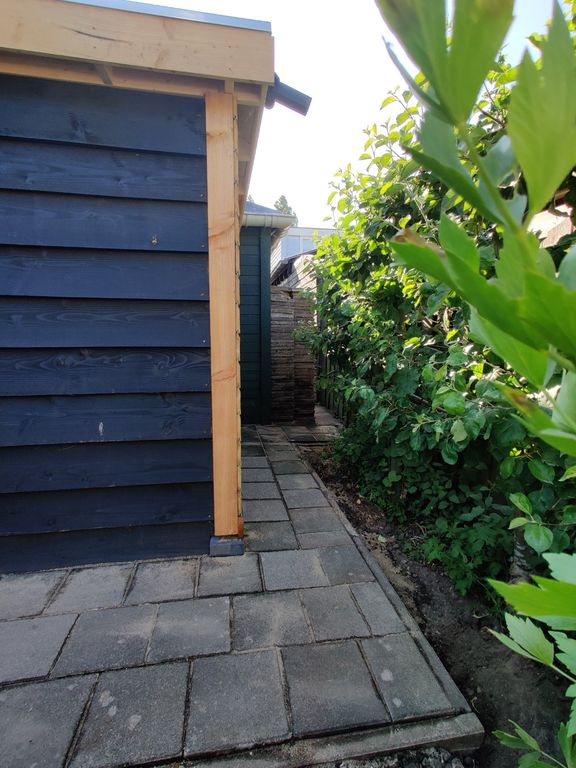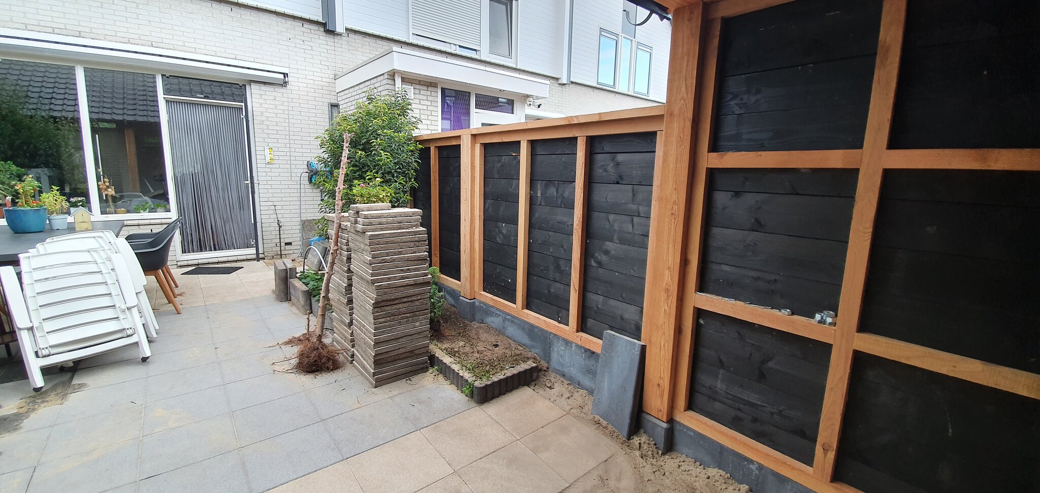 Bedankt voor de adviezen, maar we hebben het toch maar zo gelaten en geen bandjes eronder gedaan. Die hadden we niet, dat had meer tijd gekost en dan kon de stratenmaker weer niet en we gaan komend weekend naar Italie op vakantie, vandaar. Mochten die onderste planken over een paar jaar gaan rotten dan kunnen we die weer vervangen, is minder goed dan met betonbandjes eronder natuurlijk, maar dat zien we dan wel weer.