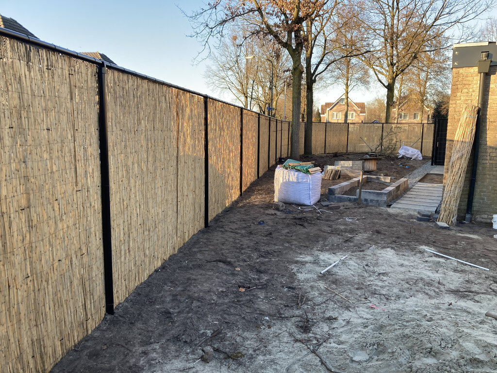 En de tuin... 55mtr rietmat tegen het gaas gezet. En daar moeten nog 220st Hedera tegen aan. Het monniken werk is nog niet helemaal gedaan zeg maar