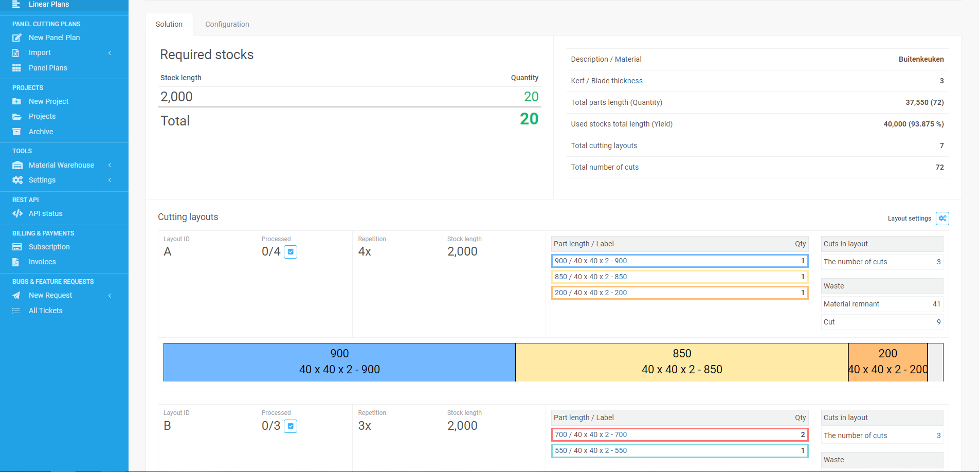 Met de materiaallijst kon ik ook een snijlijst maken, om zo efficiënt mogelijk te slijpen. Hiervoor gebruikte ik OptiCutter, ook weer de gratis (demo) versie, dikke tip!