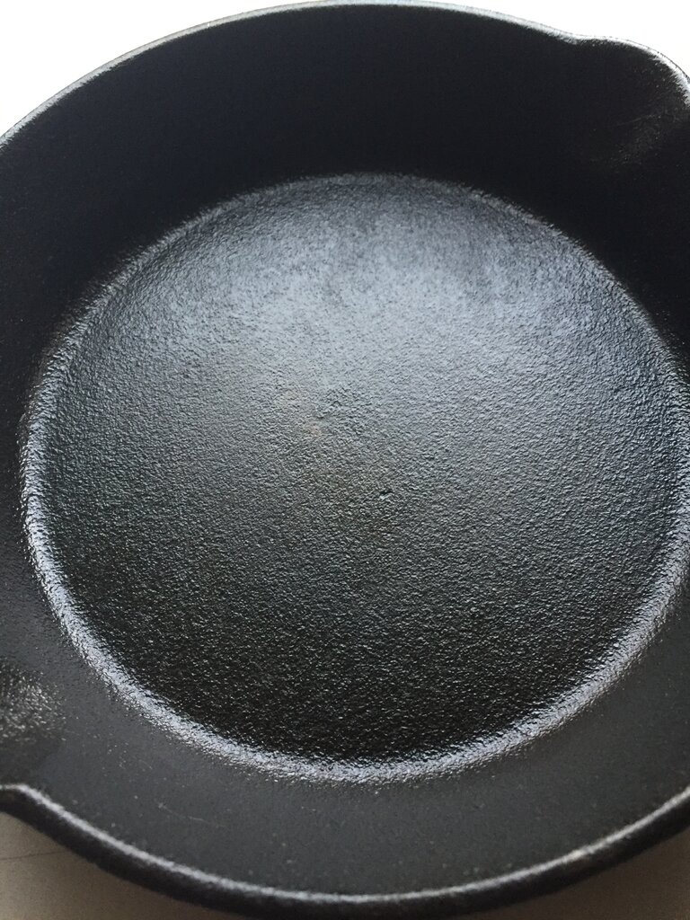 Ik ben mijn nieuwe gietijzeren steelpan aan het inbranden met Crisco. Alles volgens de regels gedaan, eerst opwarmen, dan wassen, daarna ingevet met een dunne laag Crisco en 45min in de oven geweest op 275 graden. De laatste stap al 3x. Maar op filmpjes/afbeeldingen op internet zie ik de bodems altijd mooi glad en egaal worden, die van mij blijft ‘korrelig/grof’. Zie afbeelding. Is de pan nu wel goed ingebrand?